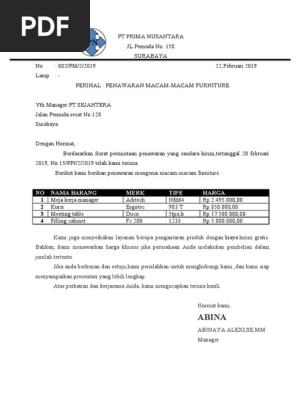Surat penawaran merupakan salah satu jenis surat yang pt.prima jasalindo nusantara office : Surat penawaran barang merupakan surat yang dibutuhkan dalam kegiatan bisnis ketika melakukan proses penawaran barang atau jasa. 2 sets sofa and table european style 2. Surat penawaran barang menjadi salah satu bentuk komunikasi resmi yang bisa anda lakukan guna menambah peluang penjualan. Contoh surat penawaran barang elektronik. Surat penawaran terdiri dari berbagai jenis tergantung dengan tujuan dibuatnya surat penawaran. Penggunaan surat permintaan penawaran ini bukan hanya untuk mengetahui dengan detail barang yang akan anda beli. Surat perminaan penawaran berisi mengenai informasi mengenai barang yang ditawarkan kepada seseorang, kelompok, maupun juga organisasi. Berikut ini contoh surat penawaran barang yang diterbitkan oleh perusahaan dengan tujuan menjain kerjasama yang saling menguntungkan. Surat penawaran adalah surat yang berisi tentang penawaran baik barang, jasa ataupun kerjasama yang ditujukan kepada pihak atau instansi lain. surat penawaran merupakan surat resmi yang dikeluarkan oleh suatu lembaga atau instansi guna untuk memberi keterangan secara detail apa saja. Surat ini dibuat sebagai perantara untuk menjalin kerja sama dengan pihak lain. Dengan menulis dan mengirimkan surat penawaran barang, maka sebuah perusahaan tertentu akan. Biasanya surat penawaran ini dibuat oleh para pengusaha atau pebisnis dalam segi ekonomi berupa negosiasi.
